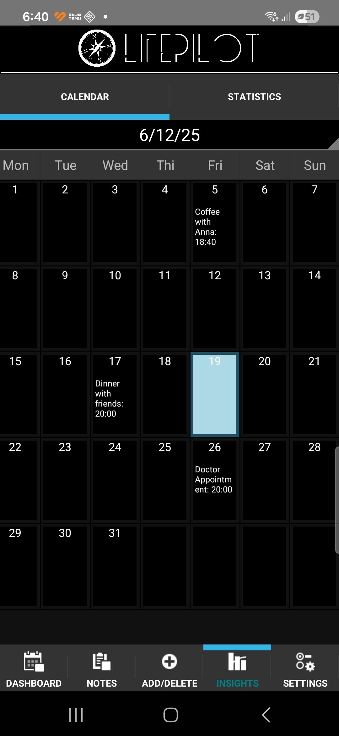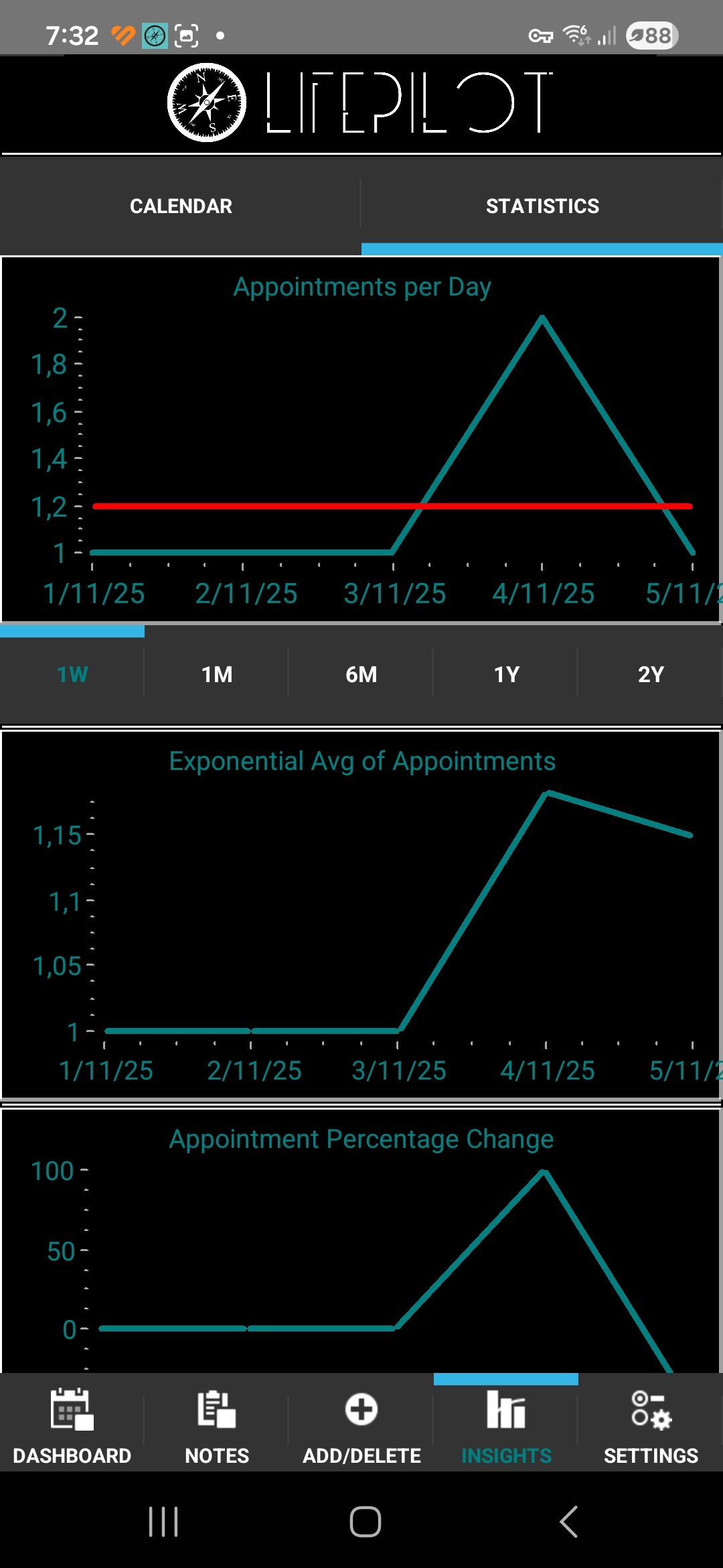 Charts and graphs display your appointments over days and weeks, highlighting peaks, recurring events, and gaps, so you can make informed adjustments. By presenting your data visually, LifePilot helps you gain meaningful insights into your habits, giving you the clarity needed to plan smarter and improve your daily workflow.