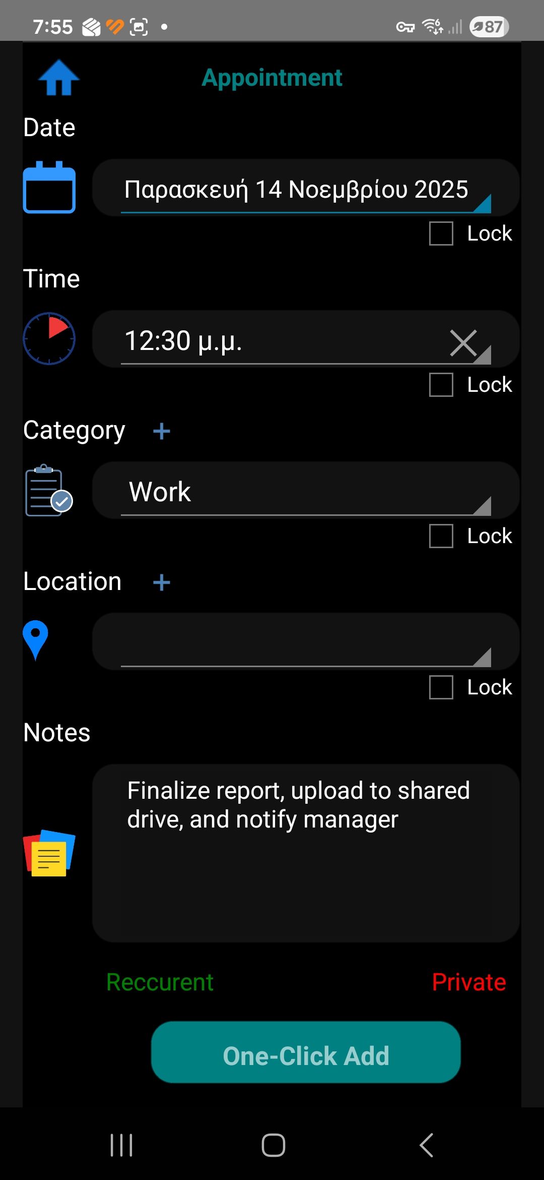You can set recurring events on a daily, weekly, monthly or yearly basis, adjusting every detail to match your exact needs. Custom reminders ensure you’re notified exactly when you need to be, with multiple alert options for complete flexibility. Every appointment can include additional notes, location tag and categories to keep your schedule organized and meaningful.
