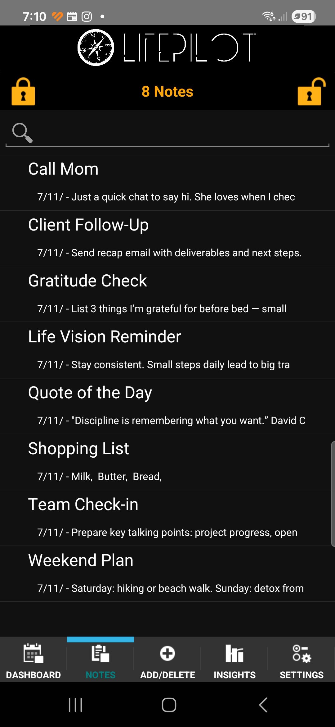 LifePilot provides an innovative and intuitive way to manage your notes, allowing you to capture, track, and reflect on your ideas effortlessly. Notes can be visualized on a categorized board, making it easy to spot connections and patterns, while comparing notes from different days or projects helps you monitor progress and prioritize effectively.